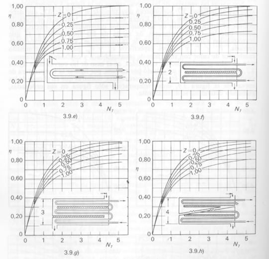 A continuació es mostren els gràfics del mètode E-NTU per diferents equips o configuracions diferents (η = ε, i NT = NTU ):
